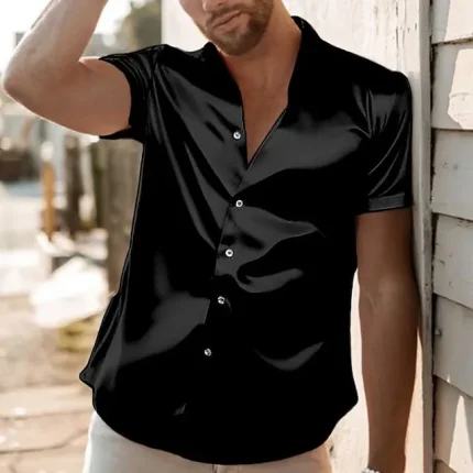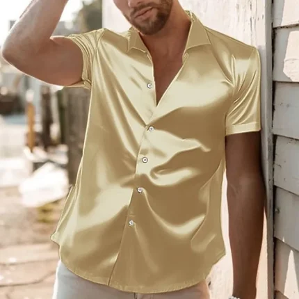 Men’s Shirt Button Up Shirt Casual Shirt Satin Silk Shirt Black Gold Short Sleeve Plain Lapel Daily Vacation Clothing Apparel Fashion Casual Comfortable