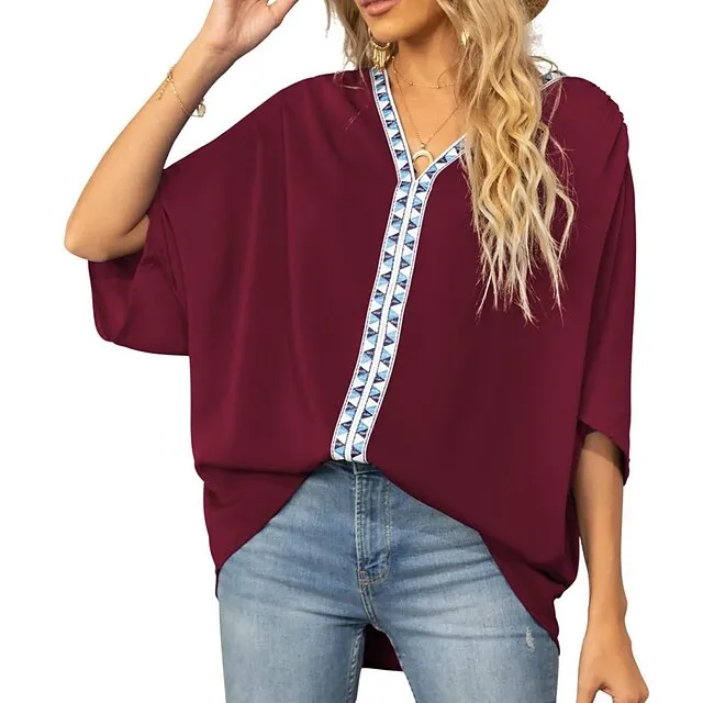 Shirt Blouse Women’s Wine Red Dark Blue Apricot Solid Color Jacquard Daily Daily V Neck Regular Fit S