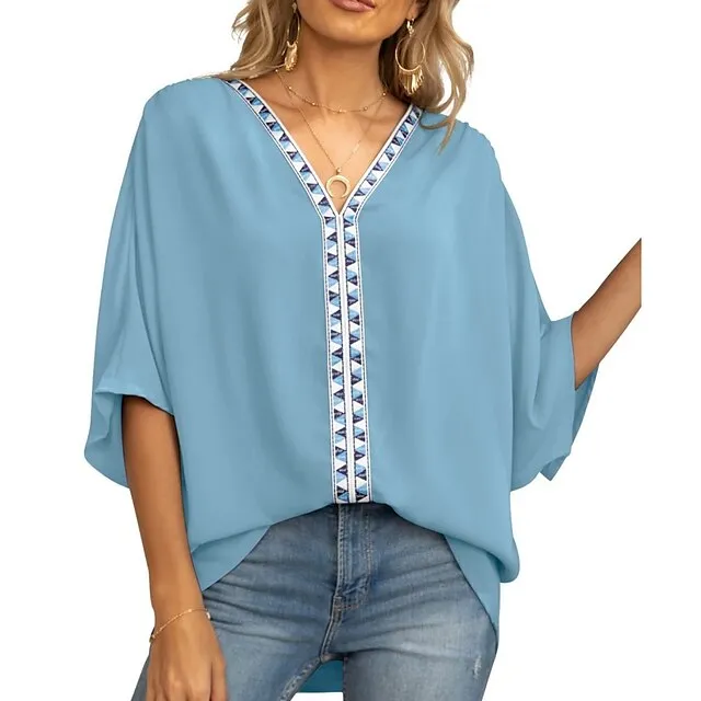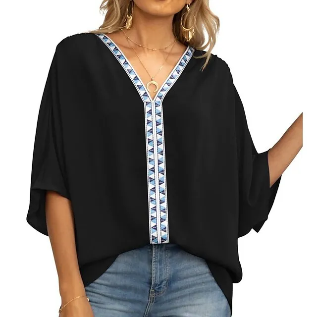 Blouse Women’s Black White Wine Solid / Plain Color Chiffon Thin Daily Basic Neon & Bright V Neck Batwing Sleeve S