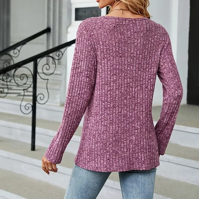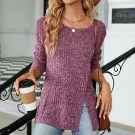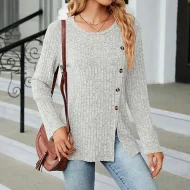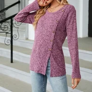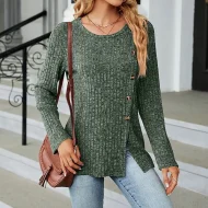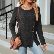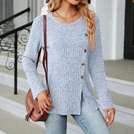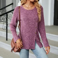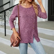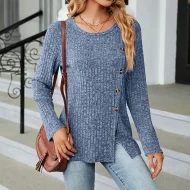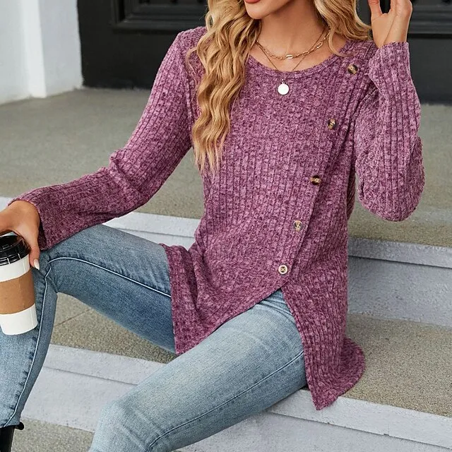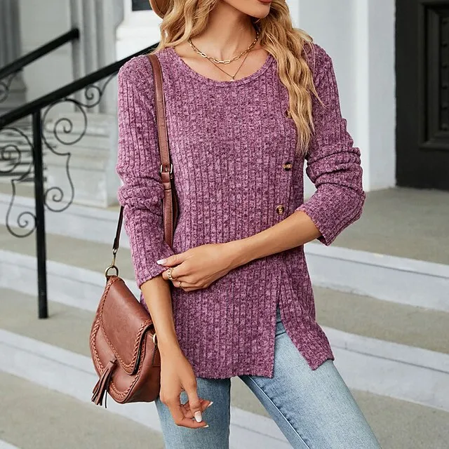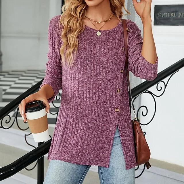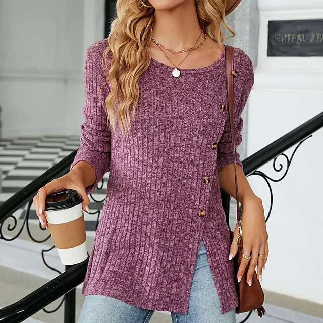 Shirt Blouse Women’s Black Blue Fuchsia Solid / Plain Color Button Split Daily Fashion Round Neck Regular Fit S