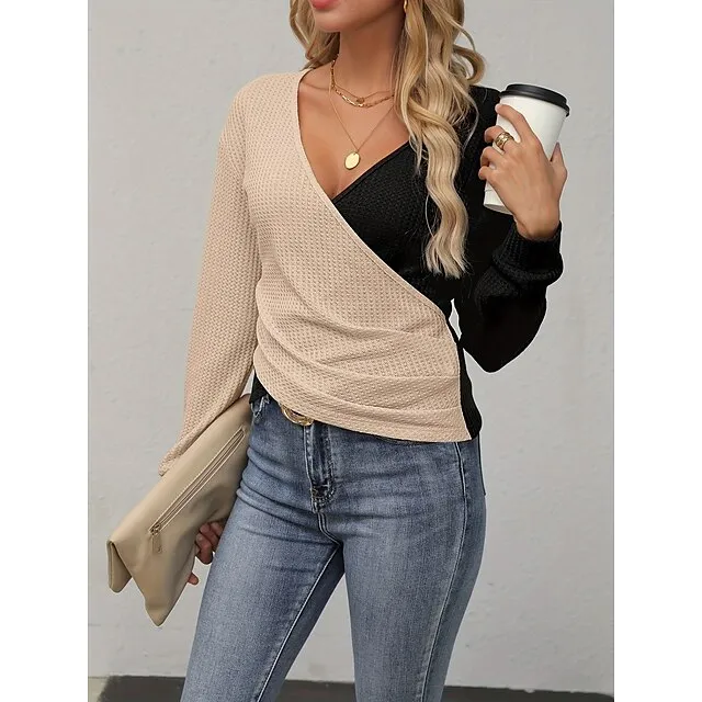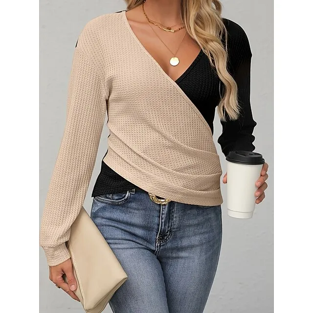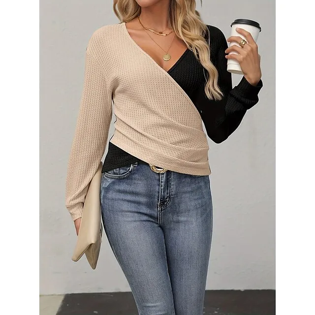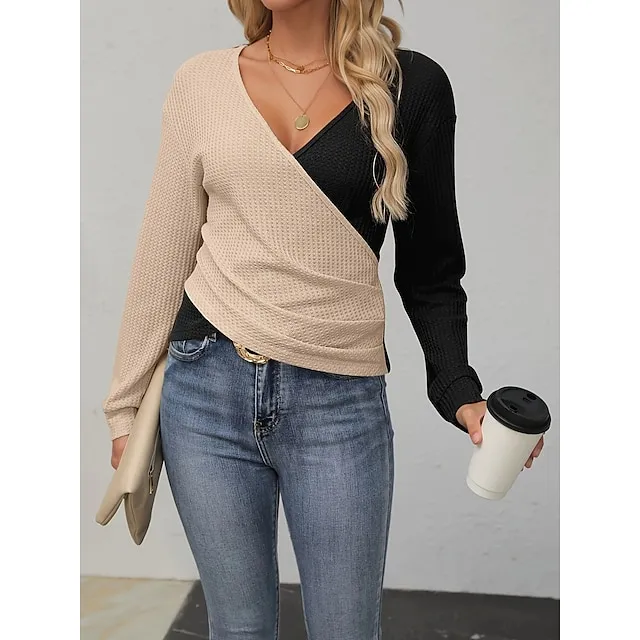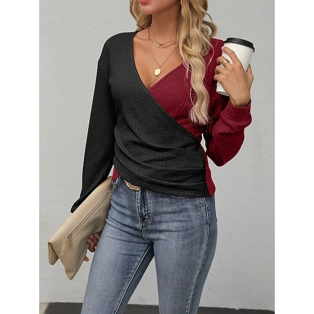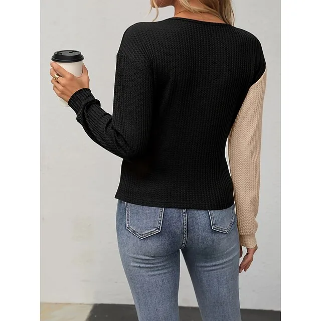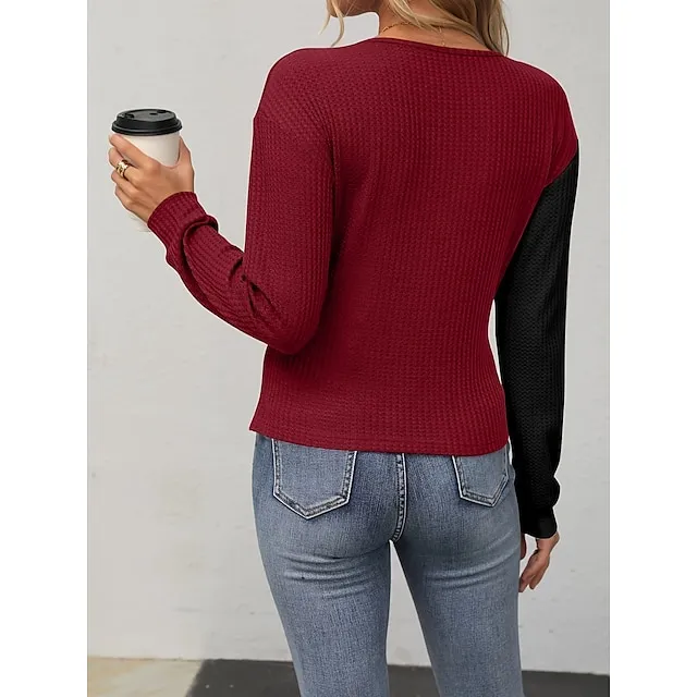 T shirt Tee Women’s Black Wine Brown Color Block Patchwork Daily Weekend Fashion V Neck Regular Fit S