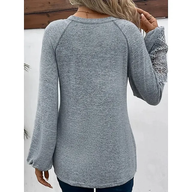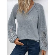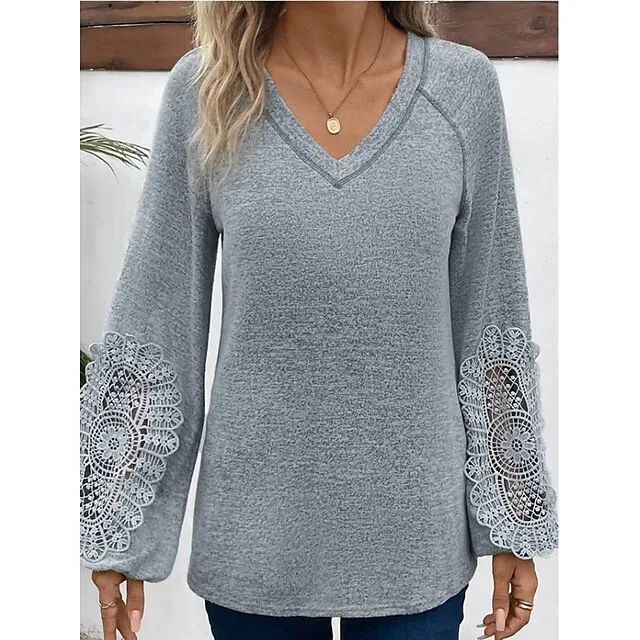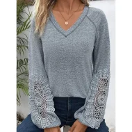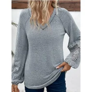 T shirt Tee Women’s Gray Plain Lace Patchwork Casual Fashion V Neck Regular Fit S
