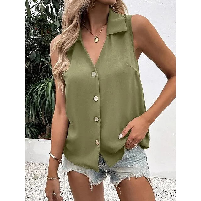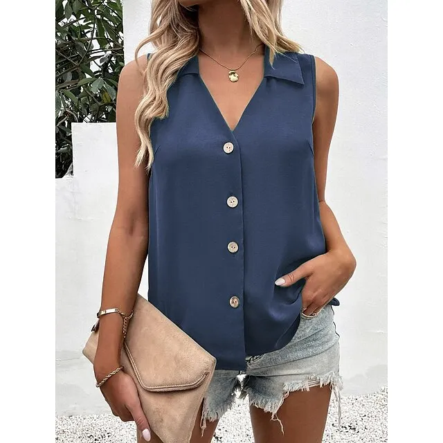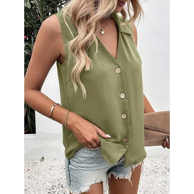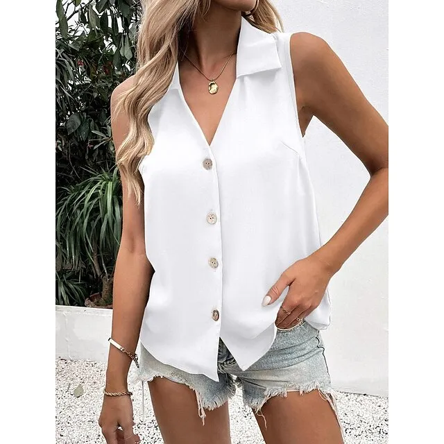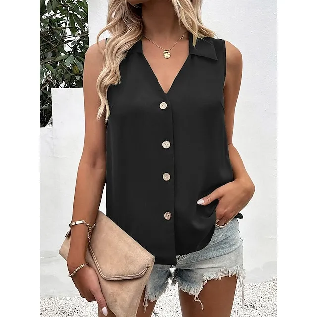 Tank Women’s Black White Wine Plain Button Cold Shoulder Street Daily Fashion Shirt Collar Regular Fit S