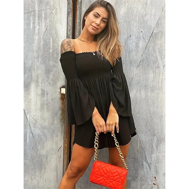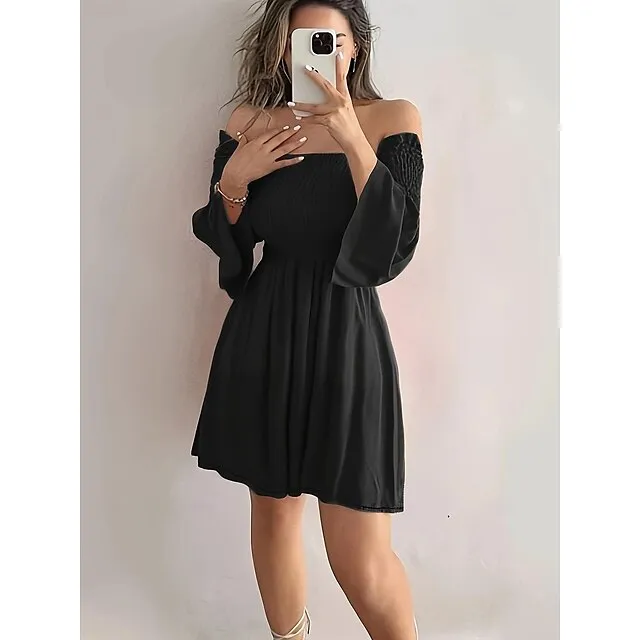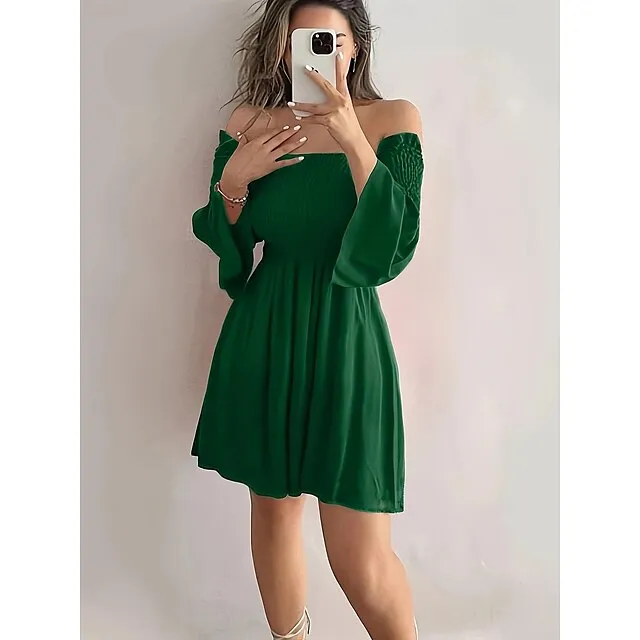 Women’s Plain Dress Mini Dress Cold Shoulder Holiday Vacation Beach A Line Off Shoulder Long Sleeve Slim Black Green Color S M L XL XXL Size