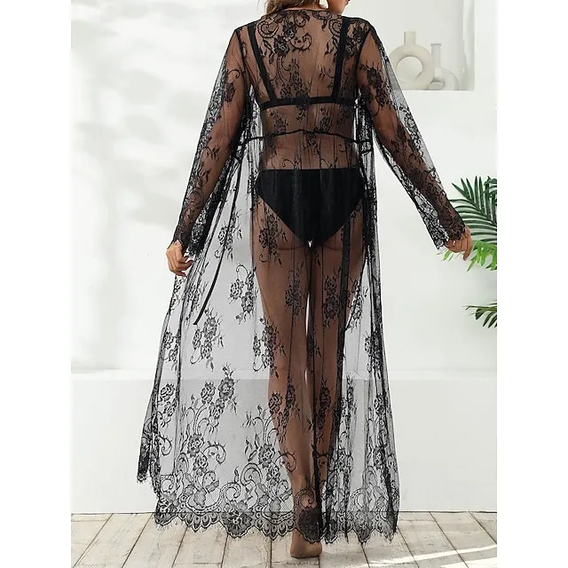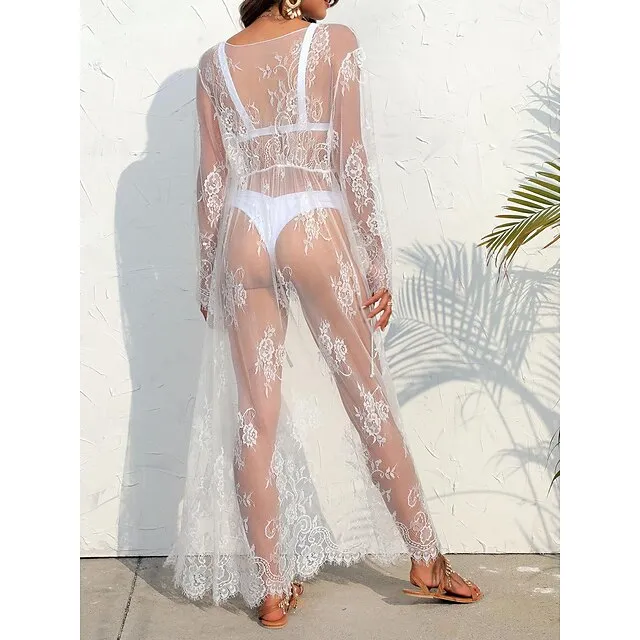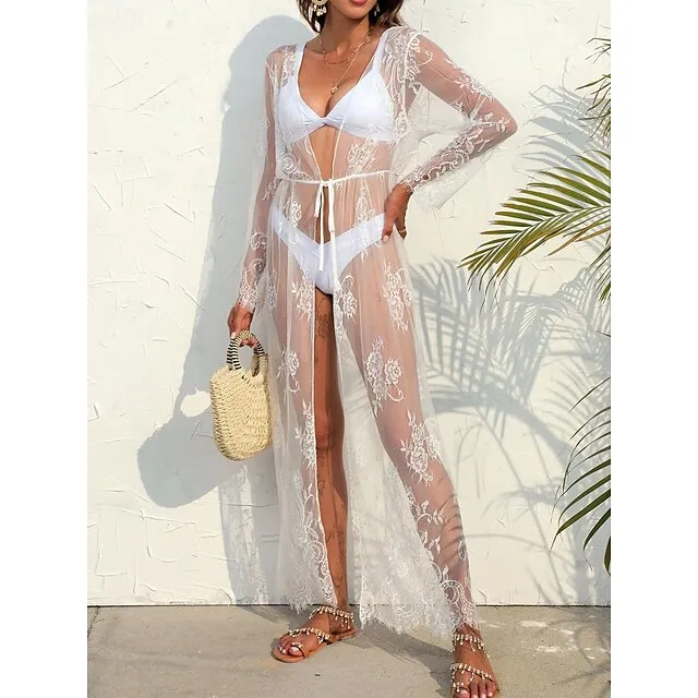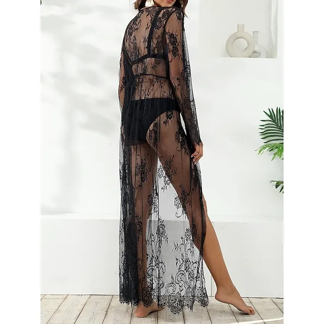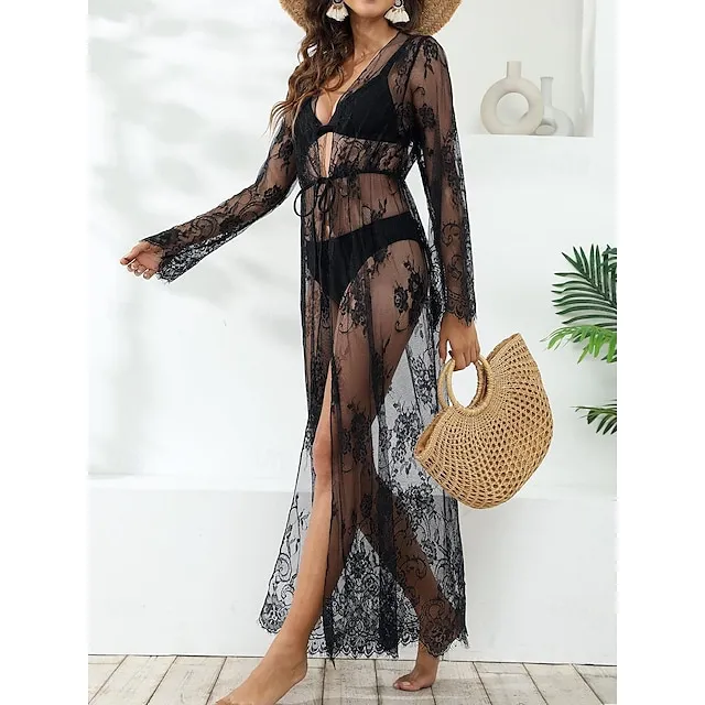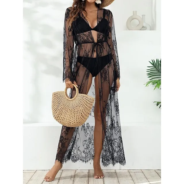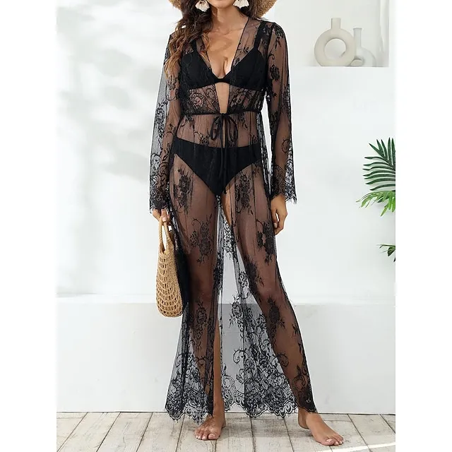 Women’s Summer Dress Cover Up Lace up Lace Vacation Swimming Pool Beach Wear Holiday Long Sleeve Black White Color S M L XL Size