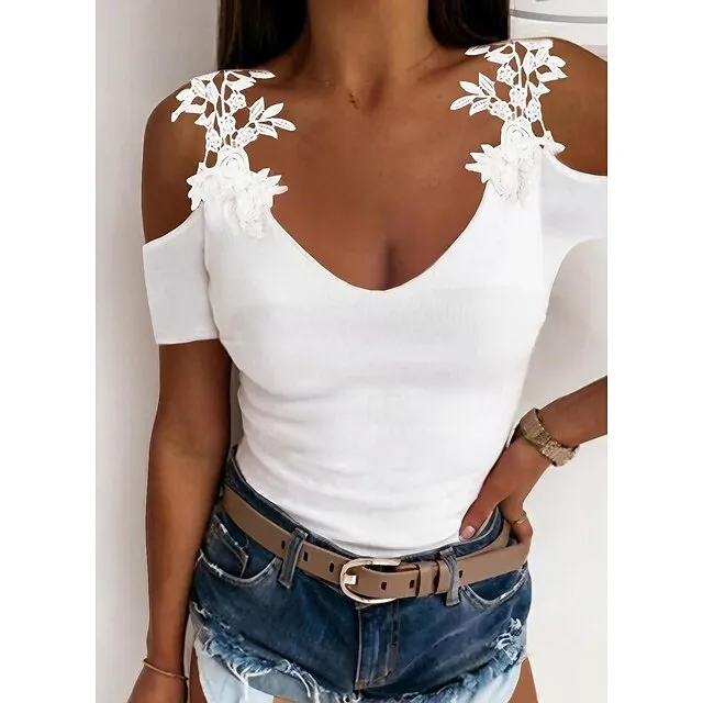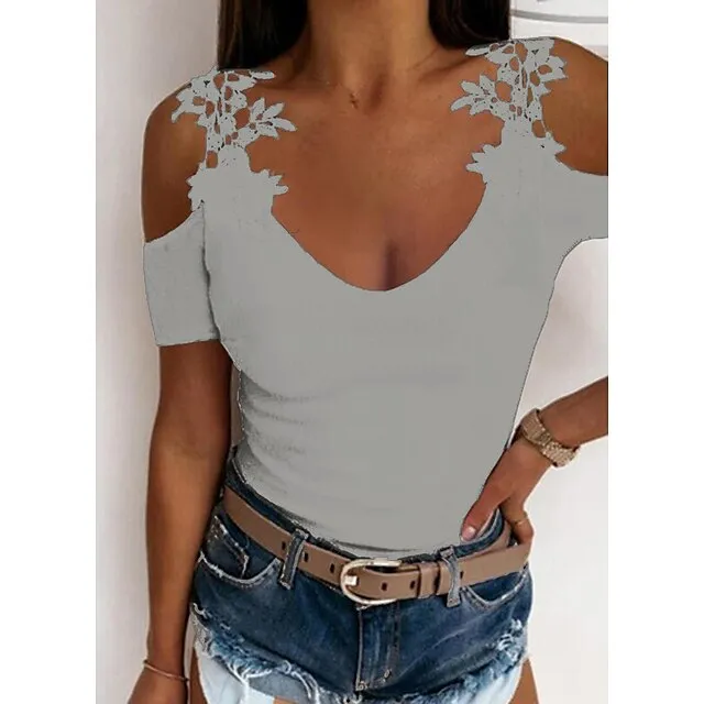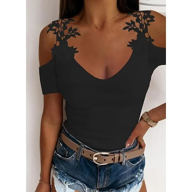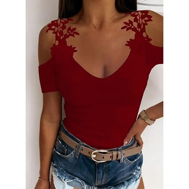 Women’s T shirt Tee Going Out Tops Burgundy Tee Concert Tops Plain Casual Weekend Cold Shoulder Black White Lace Cut Out Short Sleeve Elegant Fashion Basic U Neck Off Shoulder Regular Fit Summer