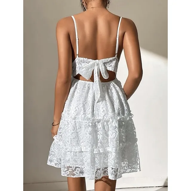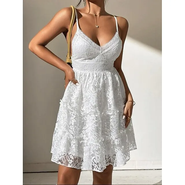 Women's White Dress Lace Dress Summer Dress Mini Dress Lace Ruffle Street Date Streetwear V Neck Sleeveless Regular Fit White Color S M L XL 2XL Size